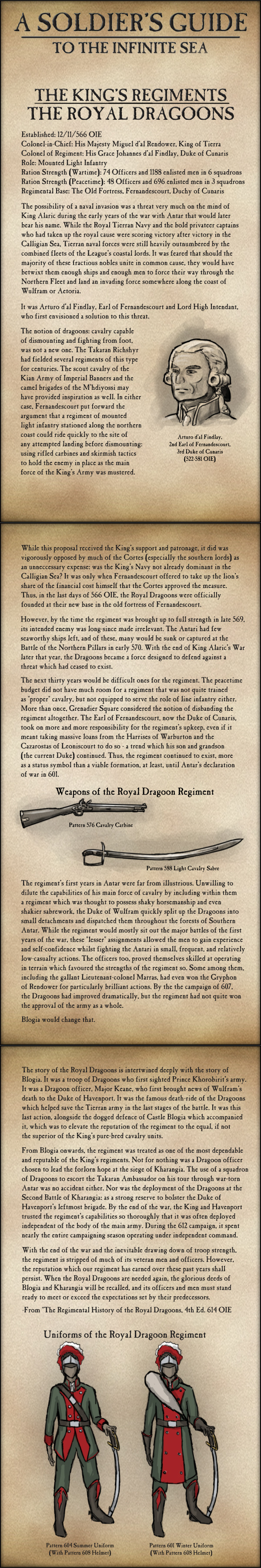 This month’s article is the long-awaited history of the Royal Dragoons, showing how the regimented developed from an improvised stopgap coastal defence force established in the first days of King Alaric’s War to a hardened veteran unit by the end of the Dozen Years’ War, nearly half a century later.